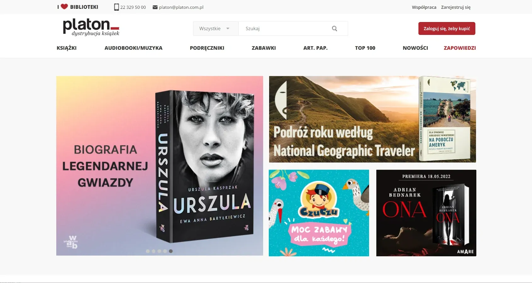 For more than six years we have been developing e-commerce systems for Platon, a company responsible for the wholesale distribution of books in the Empik group (a Polish commercial chain selling books, international press and media products). The current largest installation is the platon.com.pl portal with several thousand active users. The portal provides e-commerce services aimed at B2B customers such as bookstores, libraries and schools, and supports cooperation with publishers.