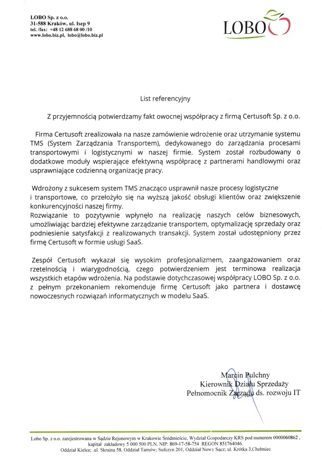 Pracowników Certusoft cechuje profesjonalizm, zaangażowanie jak również rzetelność i wiarygodność, którą potwierdza wywiązywanie się z przyjętych terminów realizacji prac. W oparciu o dotychczasową współpracę LOBO Sp. z o.o. rekomenduje firmę Certusoft jako partnera i dostawcę profesjonalnych rozwiązań informatycznych w modelu SaaS.
